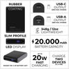 With a massive 20,000mAh capacity and a sleek, rubberized finish, our power bank offers great portability at just 348g / 12oz. Engineered with dual ports—USB-C PD (20W) and USB-A QC 3.0 (18W)—it powers up devices fast and efficiently. The integrated LCD display lets you keep track of battery life at a glance, while the ultra-slim design makes it the most space-efficient choice in its class.